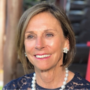 Linda Howell Headshot: Smiling woman wearing pearl earrings and necklace, dressed in navy lace, posing in warm outdoor lighting.